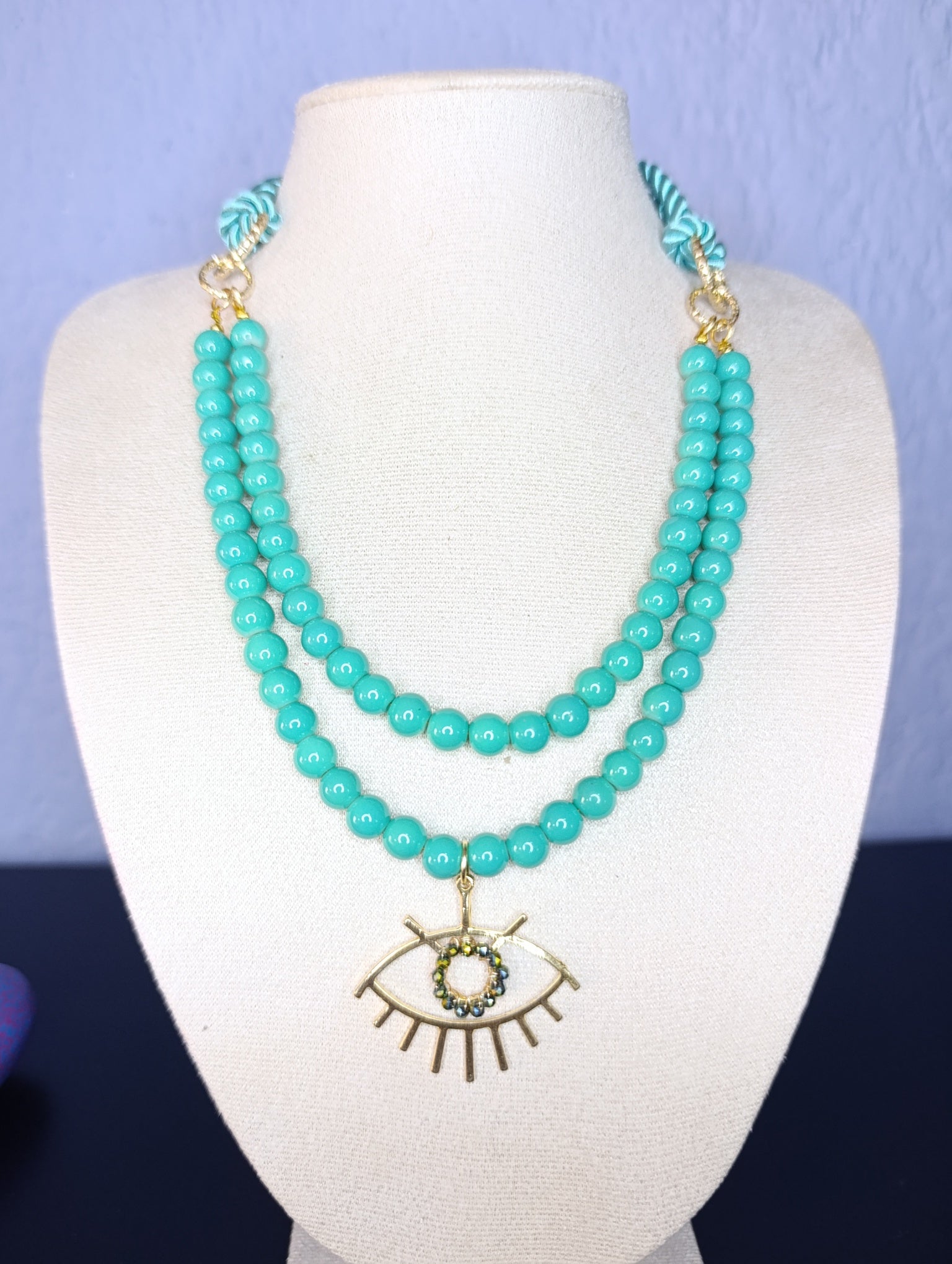 Collar Cordón y Cuencas Dobles Turquesa Dije Ojo Turco