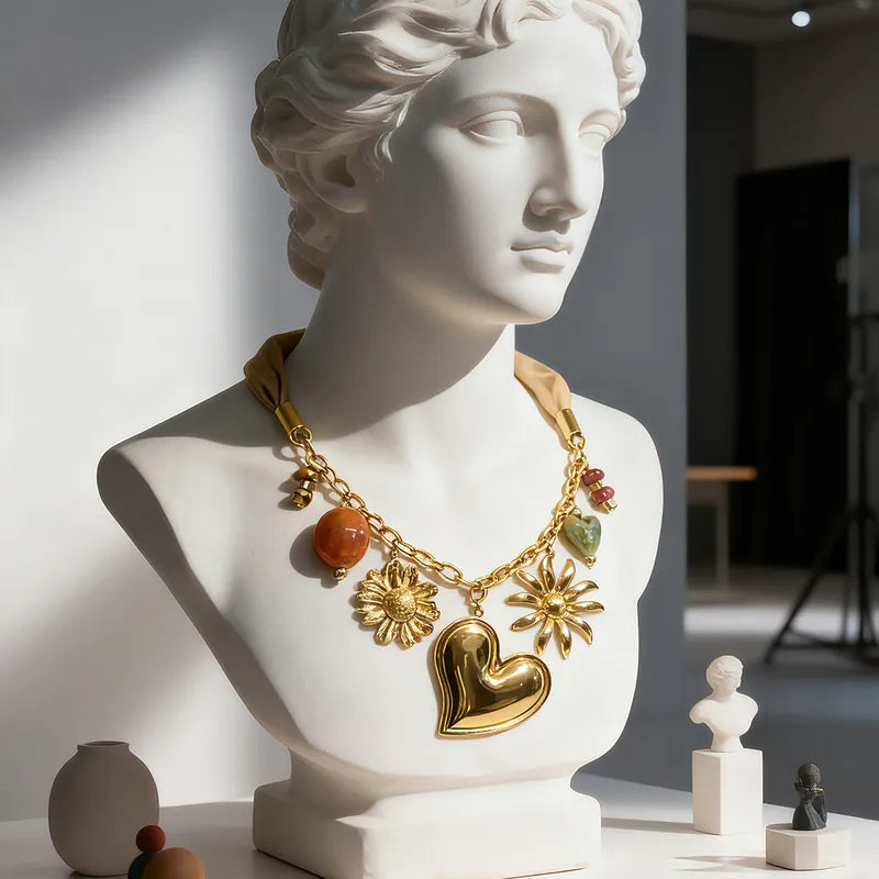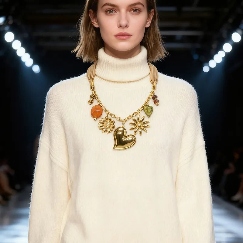 Collar Largo Tela y Cadena Dijes Varios Corazones y Soles