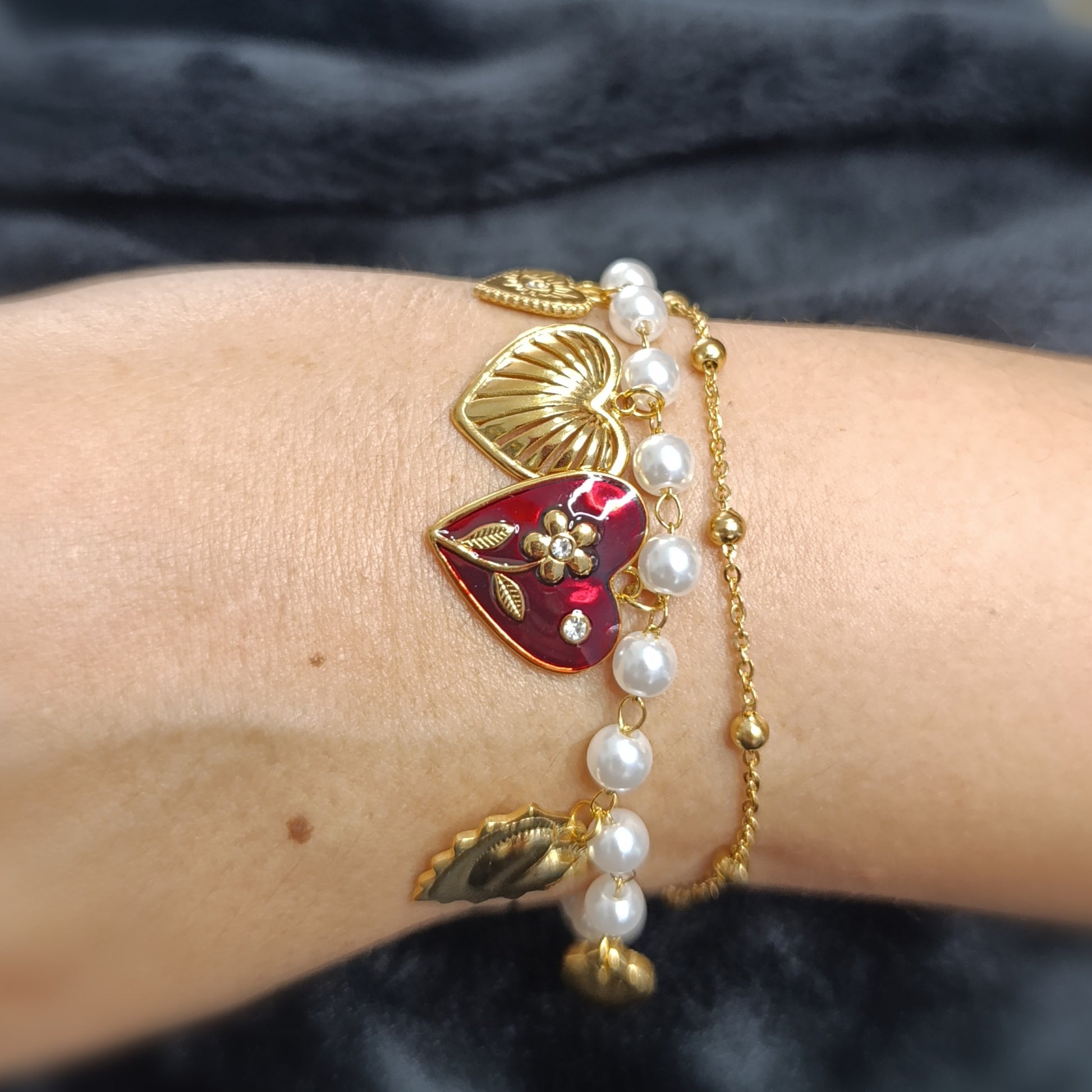 Pulsera Doble Cadena Dorada y Perlas Dijes Corazones