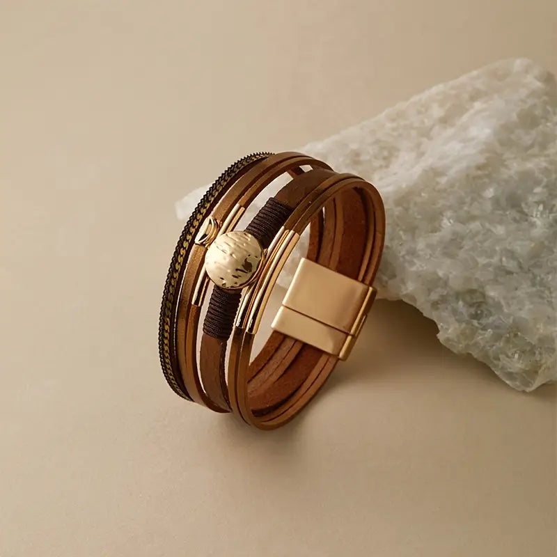 Pulsera Piel Marrón Ronda Circular Dorada